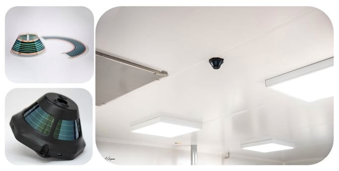 OPV module printed as a flat circular sheet and assembled into a cone, integrated into a 360° smart building PIR sensor, and installed on a living-space rooftop where full light exposure maximizes performance under all lighting conditions