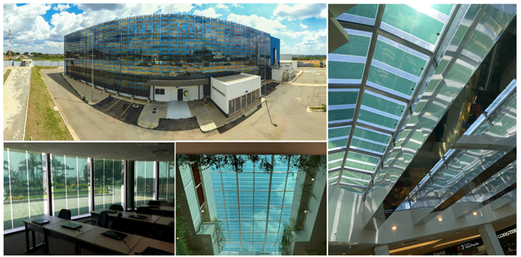 glass-glass façade installation, façade integration on an office building, and skylight installations in a shopping mall